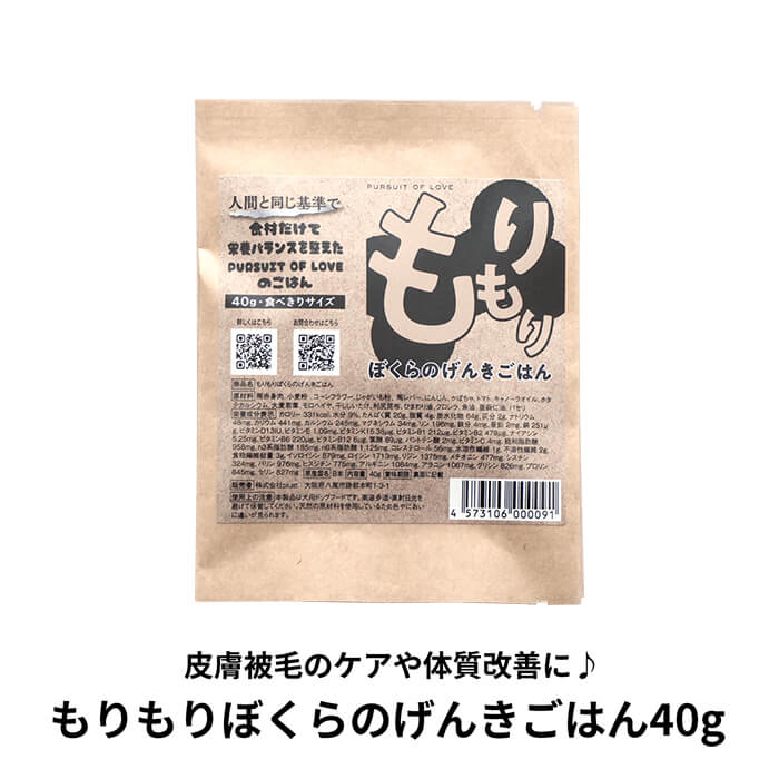 馬赤身肉、小麦粉 、コーンフラワー、じゃがいも粉、 ポークレバー、にんじん、かぼちゃ、トマト、キャノーラオイル、ホタテカルシウム、大麦若葉、モロヘイヤ、干ししいたけ、利尻昆布、ひまわり油、クロレラ、魚油、亜麻仁油、パセリ