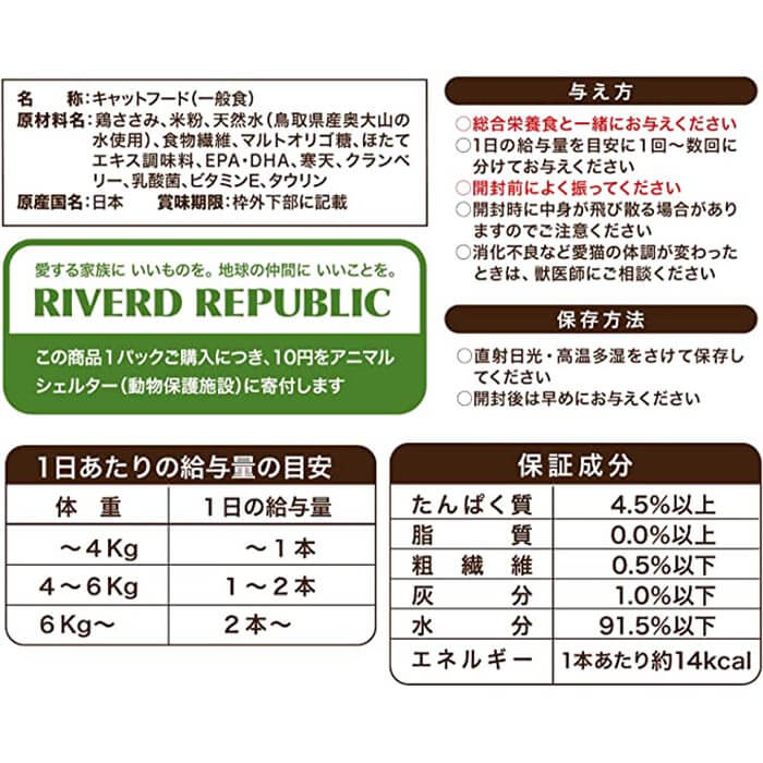 たんぱく質4.5%以上、脂質0.0%以上、粗繊維0.5%以下、灰分1.0%以下、水分91.5%以下、エネルギー約14kcal/本