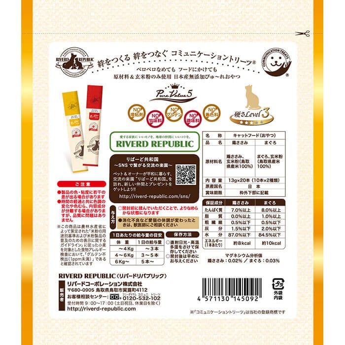 《まぐろ》たんぱく質8.0%以上、脂質1.0%以上、粗繊維0.5%以下、灰分2.0%以下、水分84.5%以下、エネルギー約10kcal/本