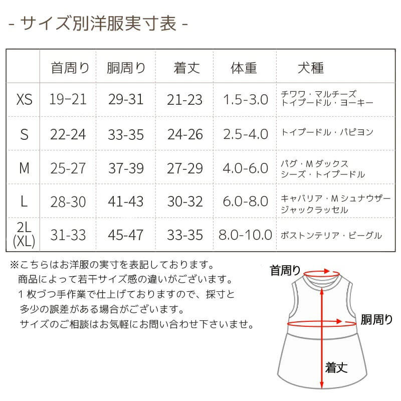 ※サイズ表は犬のボディサイズですので、服のサイズは素材やデザインによって異なります。また、商品により若干のサイズ誤差が生じる場合がございます。