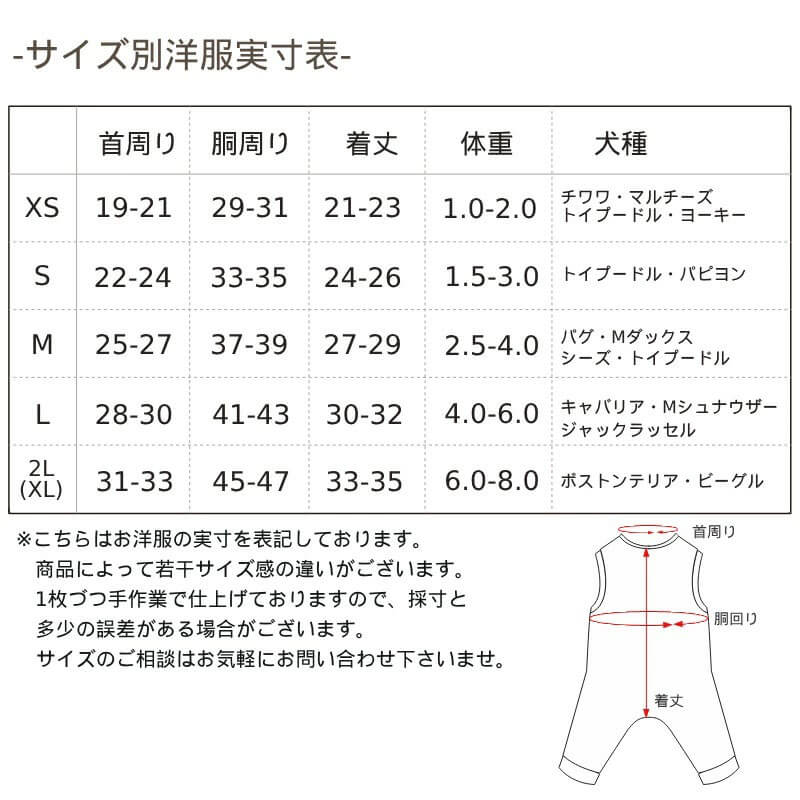 ※サイズ表は犬のボディサイズですので、服のサイズは素材やデザインによって異なります。また、商品により若干のサイズ誤差が生じる場合がございます。