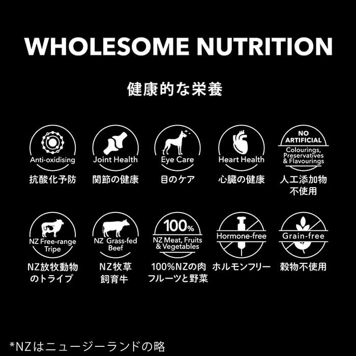 キングサーモン、ソラマメ、エンドウ豆、キングサーモンミール、ビンナガマグロ、オーシャンフィッシュミール、グリーンラムトライプ、亜麻仁、天然香料、フィッシュオイル、ひまわり油、塩化コリン、塩化ナトリウム、ブルーベリー、ニンジン、キウイフルーツ、リンゴ、ヤギミルクパウダー、緑イ貝パウダー、海藻ミール、フェヌグリークシード、ザクロジュース、キヌア、チアシード、タウリン、炭酸カルシウム、ミックストコフェロール、塩化カリウム、鉄、ビタミンE、 亜鉛、ビタミンB3、銅、ビタミンB1、ビタミンA、セレン、ビタミンB2、ビタミンB5、マンガン、ビタミンD、ビタミンB6、ビオチン、ビタミンB12、ビタミンk1、ヨウ素、葉酸【成分値】