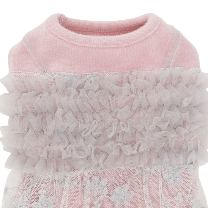 背中にはフリルをたっぷりあしらい、スカート部分には繊細なお花刺繍を施した贅沢な一着♪ナチュラルさと華やかさを両立した、特別感のある1枚で、写真映えもばっちり!