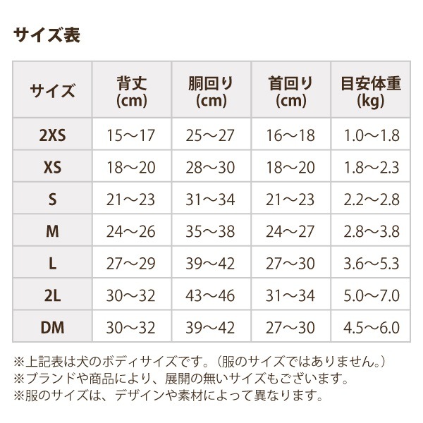 ※サイズ表は犬のボディサイズですので、服のサイズは素材やデザインによって異なります。また、商品により若干のサイズ誤差が生じる場合がございます。