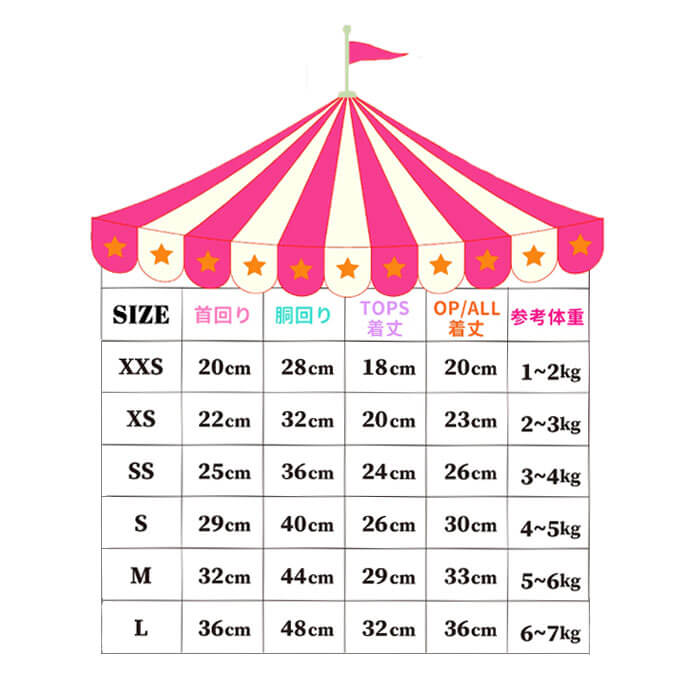 XXS・・・首20cm、胴回り28cm、着丈18cm OP/ALL 20cm、体重1~2kg