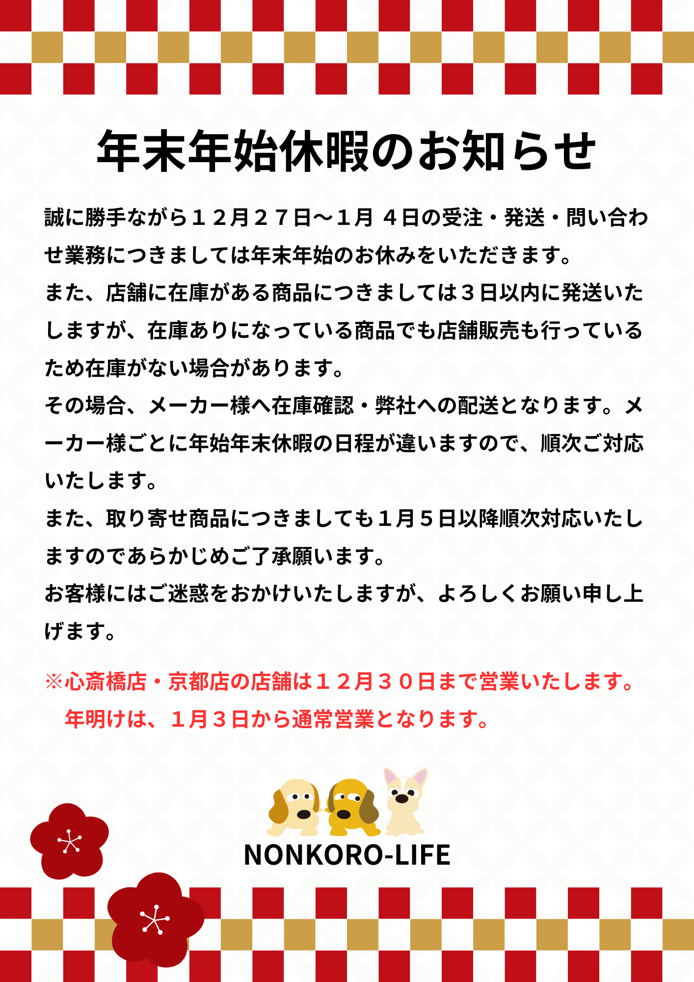 また12月22日以降(上記休み期間を除く)に付きましても、店舗に在庫がある商品に関しては発送作業を行いますが、【取り寄せ商品・店舗在庫切れの商品】につきましては、メーカー様の休暇日の関係で、1月9日以降の在庫確認になる場合もありますのでご了承ください。